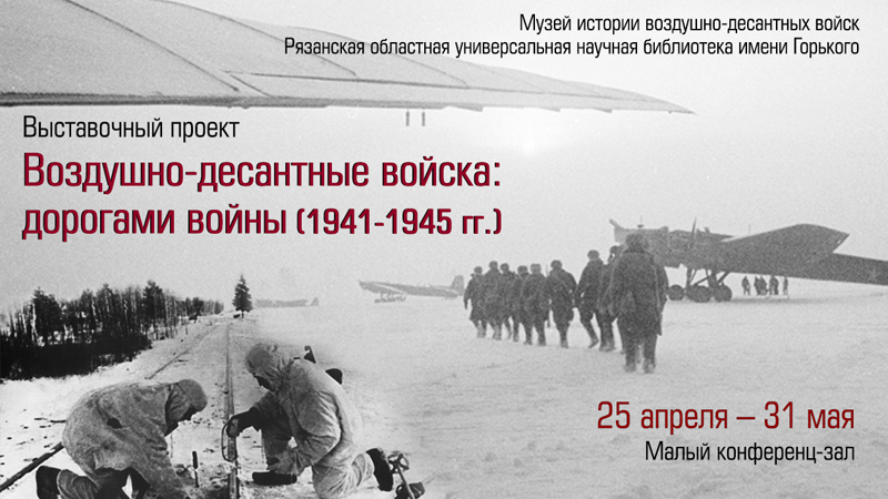 25 апреля 2022 года в областной библиотеке имени Горького состоится открытие выставки из коллекции Музея истории Воздушно-десантных войск «Воздушно-десантные войска: дорогами войны (1941-1945 гг.)», посвящённой 77-й годовщине Победы советского народа в Великой Отечественной войне.
