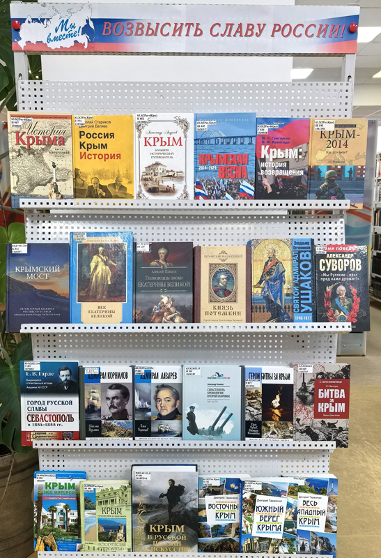 На выставке представлены книги, рассказывающие об истории Крымского полуострова с древнейших дней и до наших дней: «Россия. Крым. История» Н. Старикова, «Крым. Большой исторический путеводитель» А. Андреева, «Русский Севастополь» А. Широкорада и другие издания.
