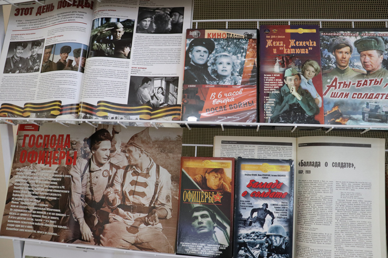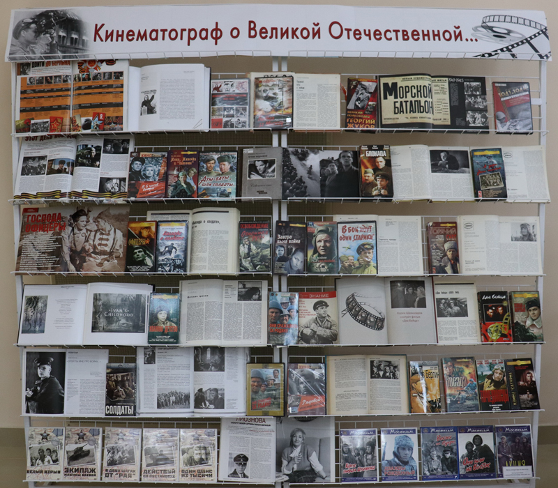 На выставке «Кинематограф о Великой Отечественной…» представлены видеокассеты и диски, рассказывающие о подвиге советского народа на фронте и в тылу. «Летят журавли», «Горячий снег», «Баллада о солдате», «Иваново детство», «Звезда», «Торпедоносцы», «Освобождение» - это неполный перечень фильмов, которые позволят окунуться в ту страшную эпоху