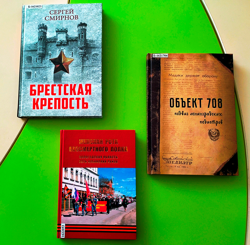 Книга Сергея Смирнова «Брестская крепость» повествует о героической обороне Брестской крепости, о ее защитниках, подвиг которых навсегда останется в нашей памяти примером великого мужества. Сборник «Женская рота Бессмертного полка» посвящен женщинам – участницам войны, уроженкам Усть-Кубинского района Вологодской области. Издание о подвиге ленинградских врачей-педиатров, помогавших выжить тысячам детей в годы Блокады Ленинграда, названо «Объект 708».