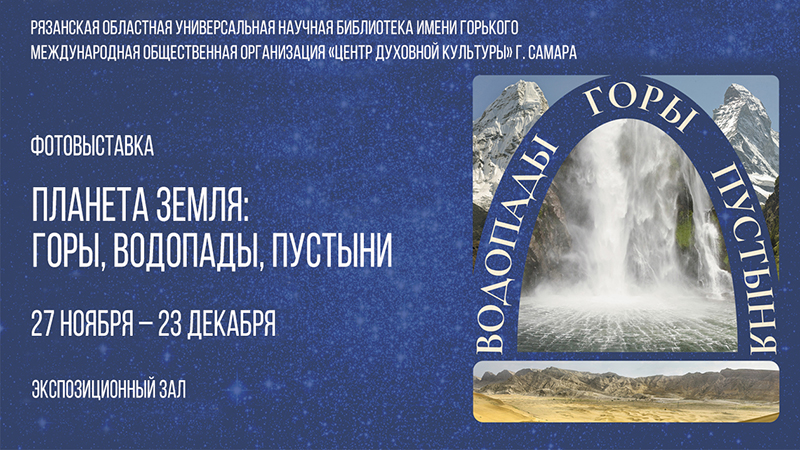 Рязанская областная библиотека имени Горького совместно с Международной общественной организацией «Центр духовной культуры» (г. Самара) представляет выставку «Планета земля: горы, водопады, пустыня».