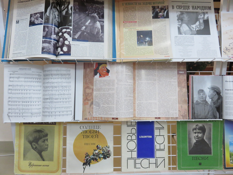 На выставке представлены книги и сборники, статьи из периодики, а также коллекция пластинок с песнями разных лет.