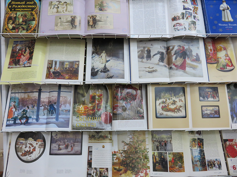 На выставке представлены альбомы с зимними пейзажами известных художников, статьи из периодических изданий с мастер-классами по созданию новогодних подарков, а также видеокассеты, нотные сборники и грампластинки с веселыми новогодними песнями.